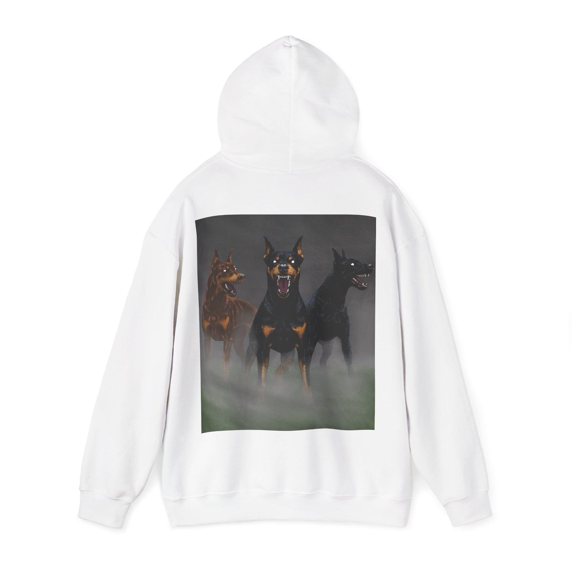 A soft, medium-weight hoodie built to carry a bold, moody print with comfort and durability. The oversized kangaroo pocket and double-lined hood feel cozy on cool mornings, while the smooth 50/50 cotton-poly blend holds vibrant Direct-to-Garment and Direct-to-Film prints without fading. The back features a striking trio of Doberman-like figures emerging from mist — a cinematic, slightly gothic scene that reads like a story worn on your shoulders. Wear it when you want to lean into evening walks, late-night coffee runs, or downtime with friends who appreciate darker, cinematic style. The tear-away label and flat, color-matched drawcord keep the look clean and comfortable.